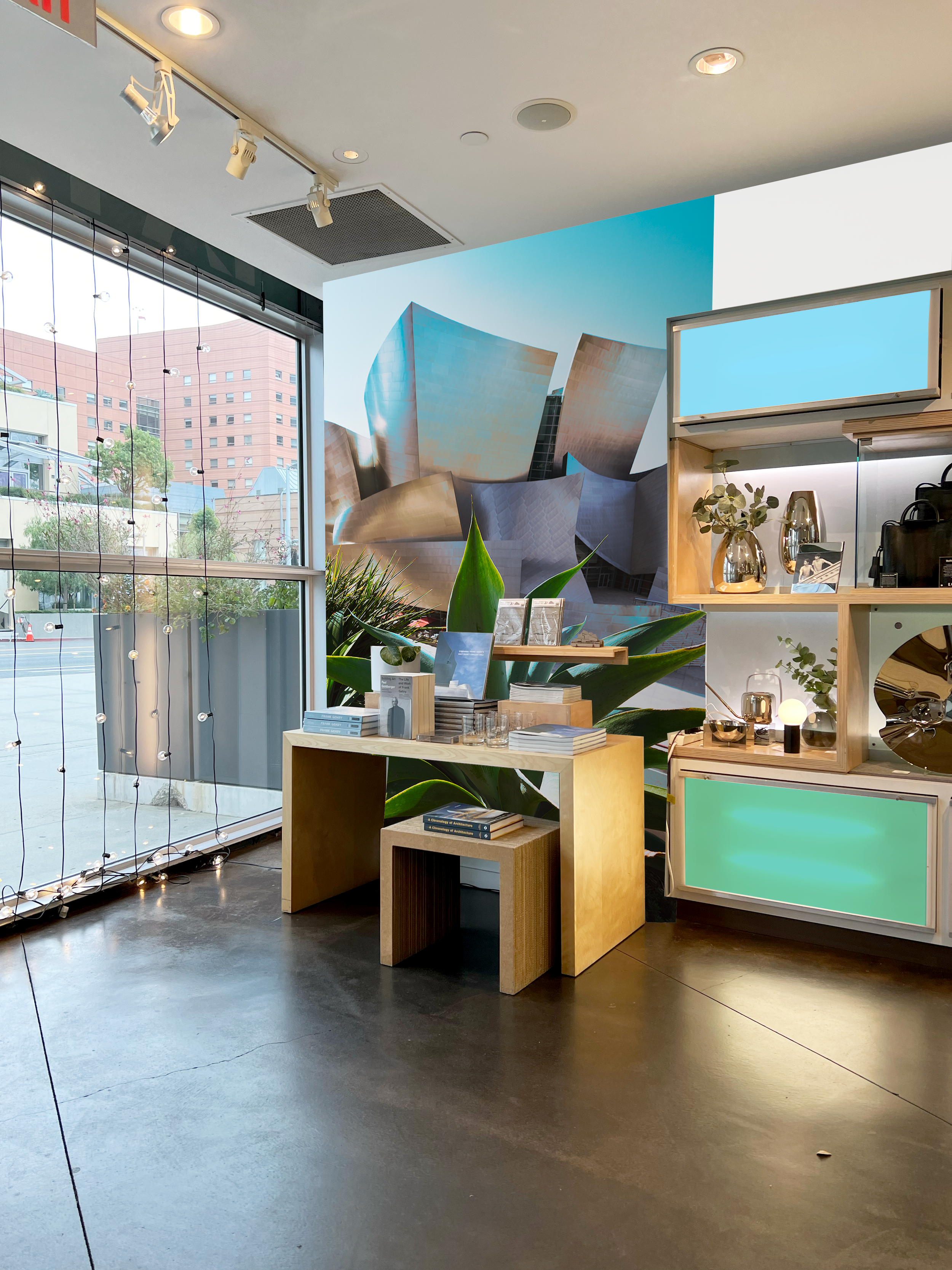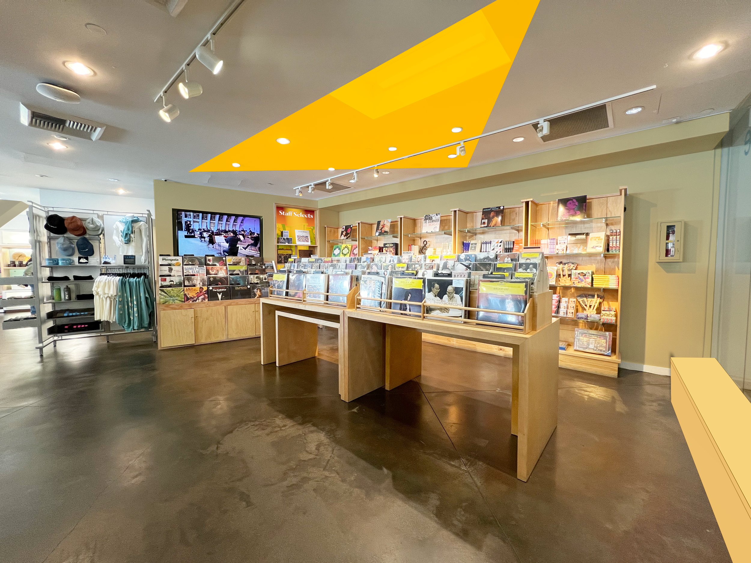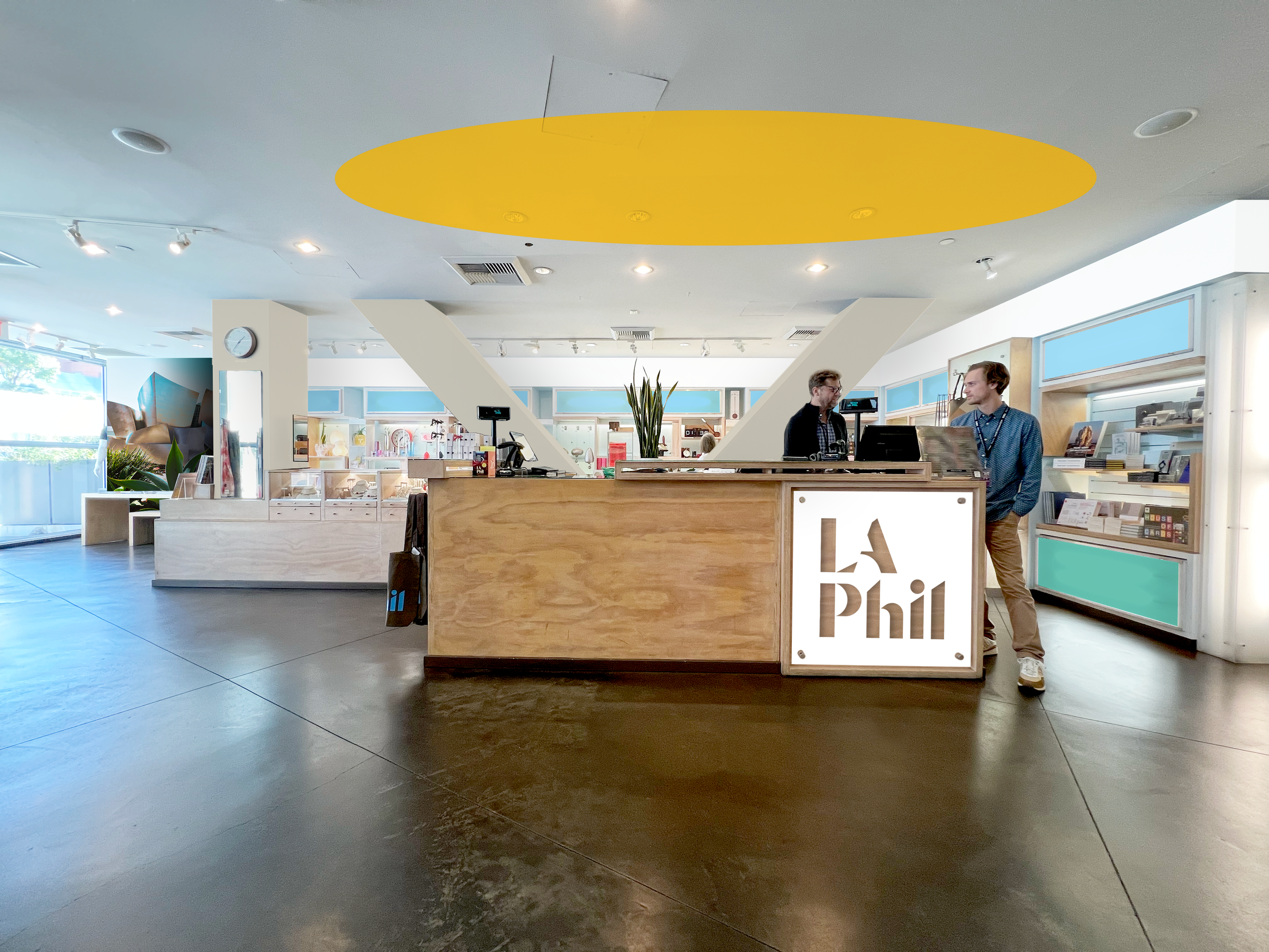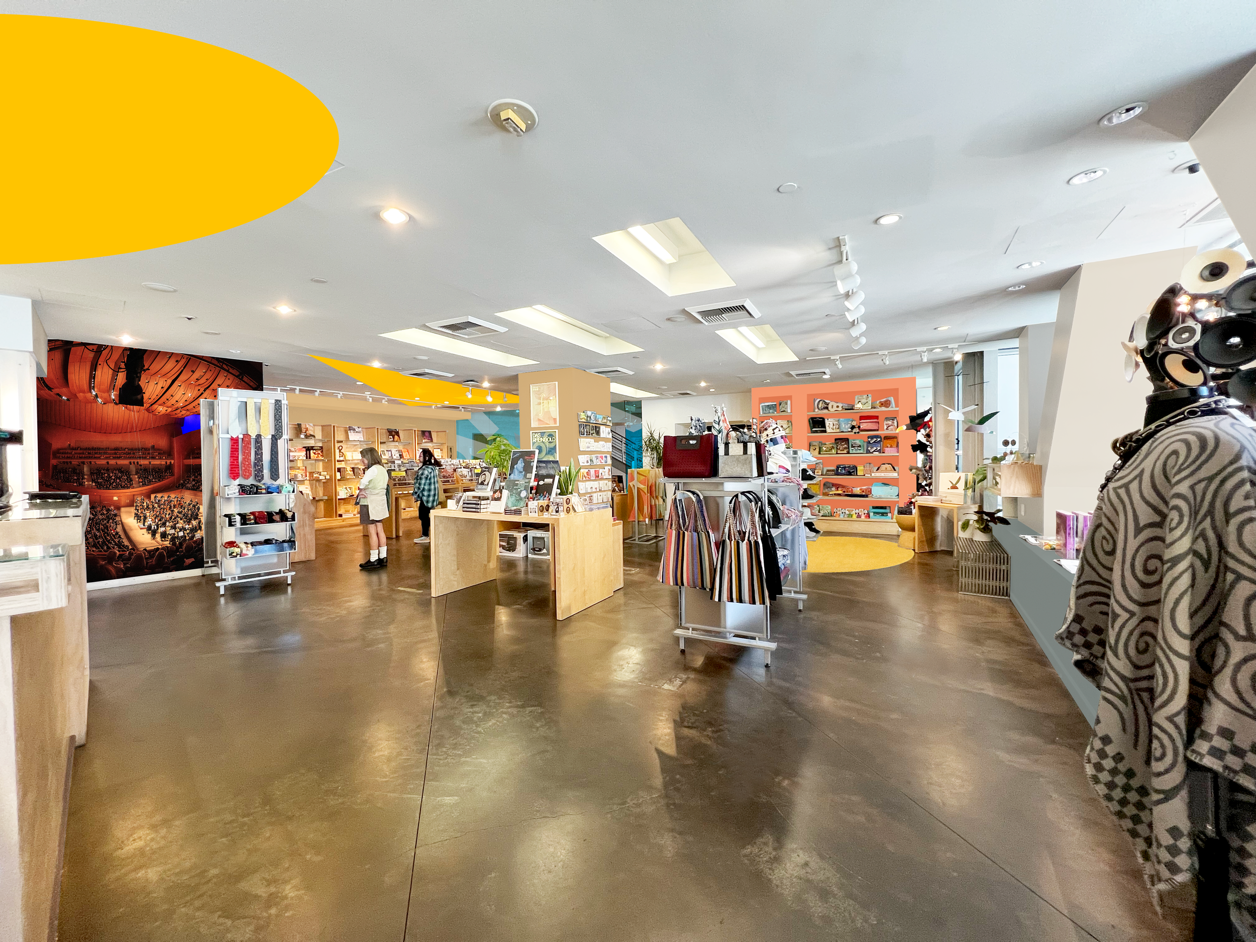 A reimagining of the LA Phil Store at Walt Disney Concert Hall with the prompt to create an inviting, vibrant space with areas of respite, super graphics and bold color blocking based on the LA Phil Store bags.