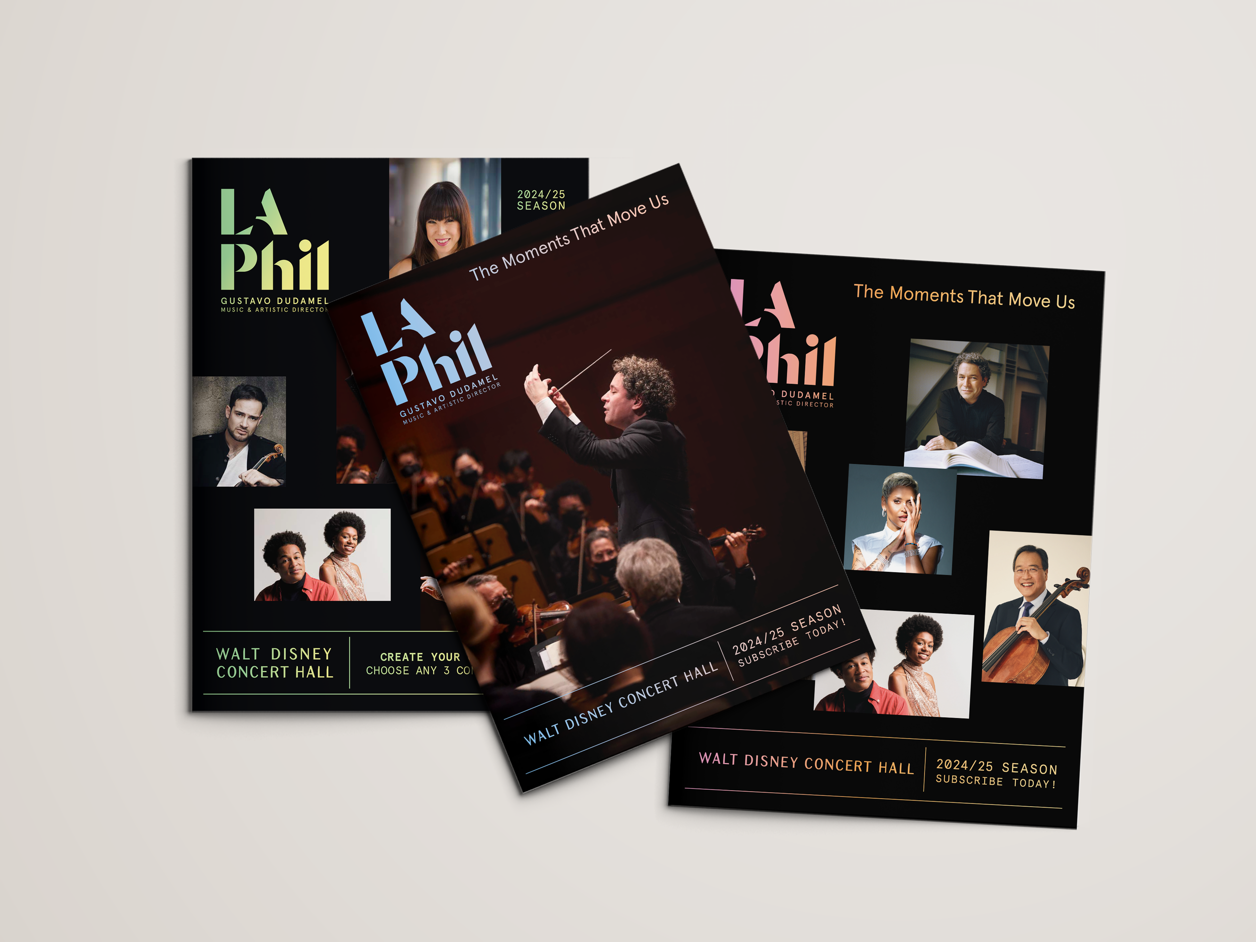 As the Associate Creative Director on the LA Phil Marketing team, I co-lead the campaign Direction and Design for the LA Phil at Walt Disney Concert Hall. Season Marketing Strategy starts in October the prior year, and launches with the announce of the season programming in February. Five major brochures, social, digital, and video campaigns are created for launch and target specific audience segments—all speaking to and building from our season campaign look and feel. Our teams work through our multi-tiered marketing plans over the spring and summer ahead of the the season start in September. LA Phil campaigns are print-led through multiple audience and genre brochures, postcards, festival brochures, out of home, and video marketing with social, and digital creative to support not only subscriptions but single-concert sales and promotions throughout the season.